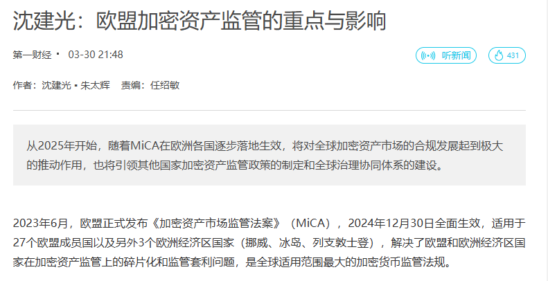欧盟通过《加密资产市场监管法案》(MiCA)抢占了监管确定性的先机 。MiCA被认为是首个全面、统一监管加密资产行业的规则,旨在应对加密市场的现实问题 。MiCA将加密资产定义为“价值或权利的数字表示,可以使用分布式账本或类似技术(如区块链)以电子方式转移和存储” 。