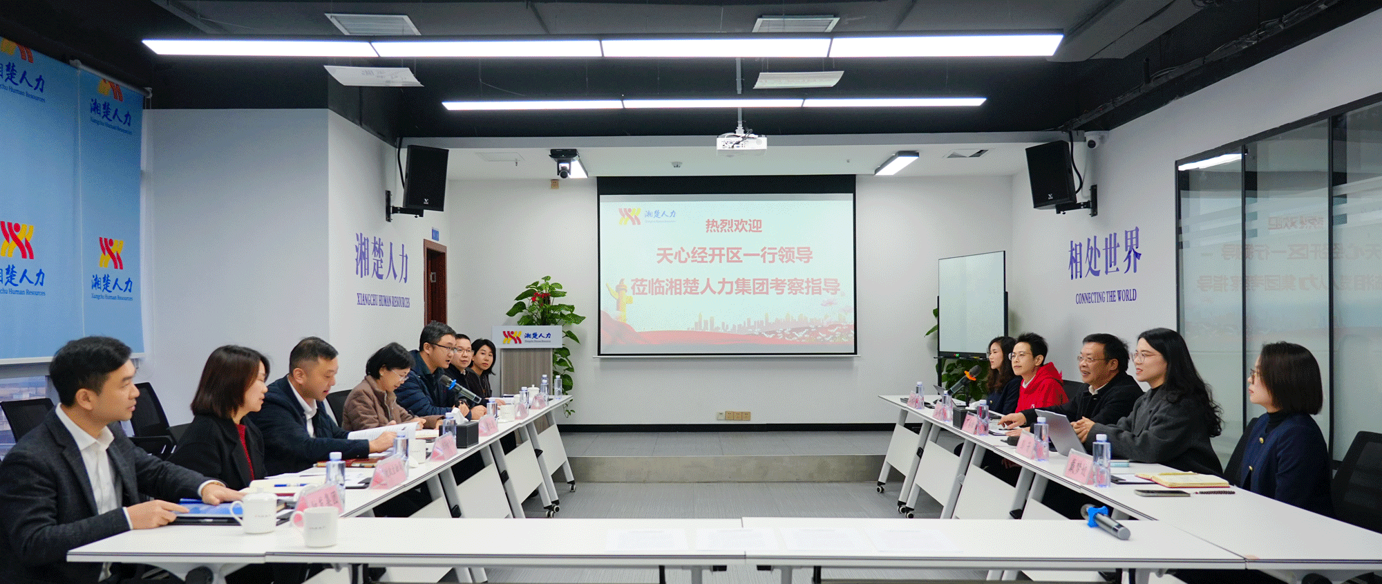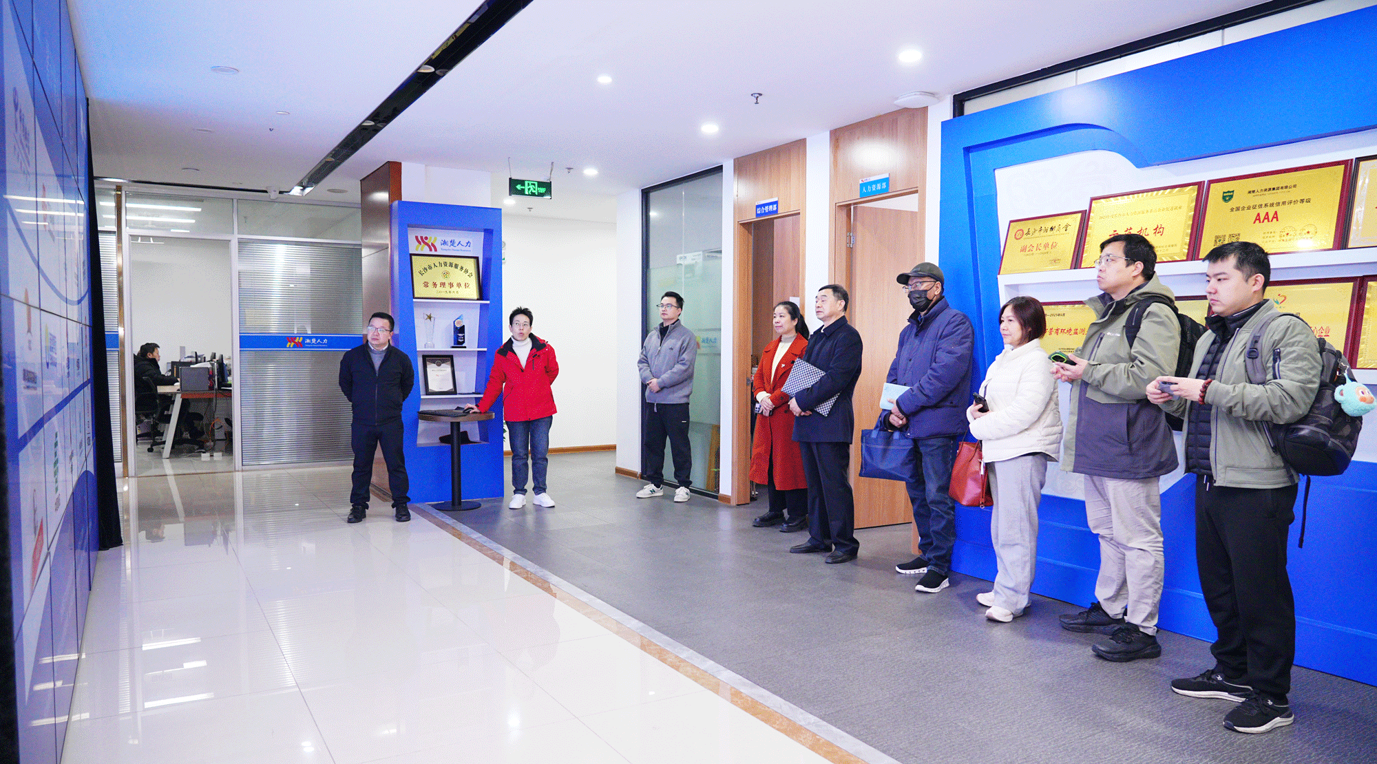 12月25日,上海市静安区人社局调研组一行莅临湘楚人力资源集团考察交流。中国人才交流协会人力资源服务产业园区专委会主任王光荣、秘书长曹新生及上海市静安区人力资源服务产业发展中心主任孙正等领导,在天心经开区管委会副主任周雷陪同下,实地调研集团数字化人力资源服务体系及创新成果。湘楚人力资源集团高管向调研组重点介绍了“叮叮优护”“乡韵赶工”等标杆项目,展示区块链存证、AI智能匹配等技术在人力资源服务领域的应用。