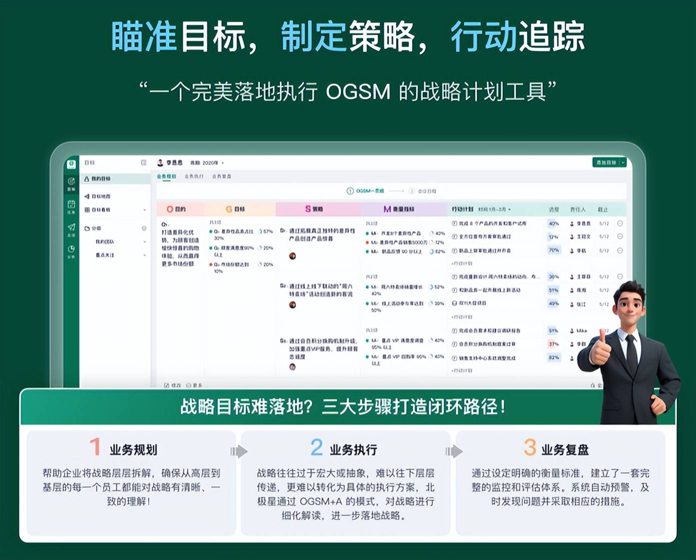 北极星OGSM并非简单的数字化表格,而是一套集战略拆解、数据联动、实时监控、动态复盘于一体的综合性战略管理平台,其核心功能体现在三个方面:
