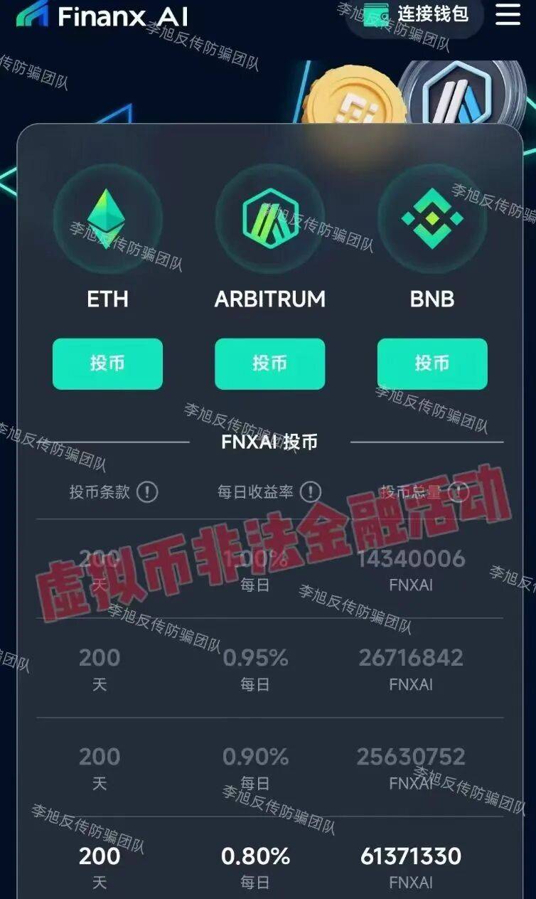 该项目发行“FNXAI”币,虚构技术背景与升值前景,按投资金额设定VIP等级,并设立推荐奖励机制,诱导用户参与炒作与发展下线。