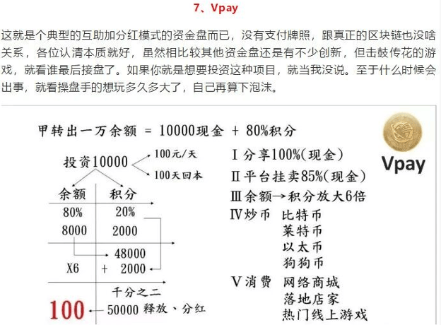 2017年11月,一名自称“谷歌前高管”的操盘者推出Vpay平台,打着“去中心化跨境支付”的旗号,宣称“无手续费、手机就能挖矿赚币”。平台首发1000万枚Vpay币(VPC),定价1.2元/枚,喊着“永不增发”的口号,将自己包装成区块链创新项目。但本质上,该平台就是个没有正经资金监管账户的空壳,所有资金全靠个人微信、支付宝流转。