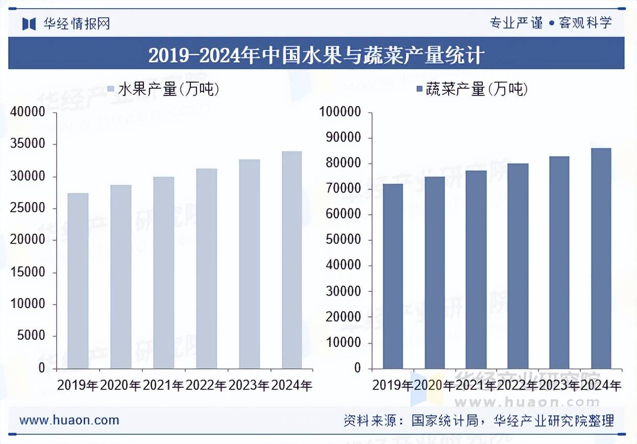 食品冷链仓储服务主要负责将果蔬等易腐、易变质食品在冷库等低温设施中进行储存、出入库及库存管理,并通过温控、信息化手段确保食品在整个存储期间始终处于规定低温环境,以保障食品质量、延长保质期、减少损耗。2024年,中国水果与蔬菜产量分别为33965.81万吨、86113.98万吨。